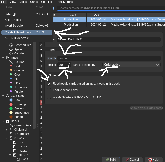 Of course, this will result in a very insane review count. So we set the option to show new cards first and show reviews randomly, and do as many reviews as desired. There will be more cards left, but that's not worth worrying about. There is no need to learn this stuff "really well", it's just a goofy system to make reading a bit easier.